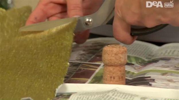 - Cospargere il tappo di sughero di colla e incollare il rettangolo di carta crespa intorno alla base del tappo, lasciando libera la cupoletta.